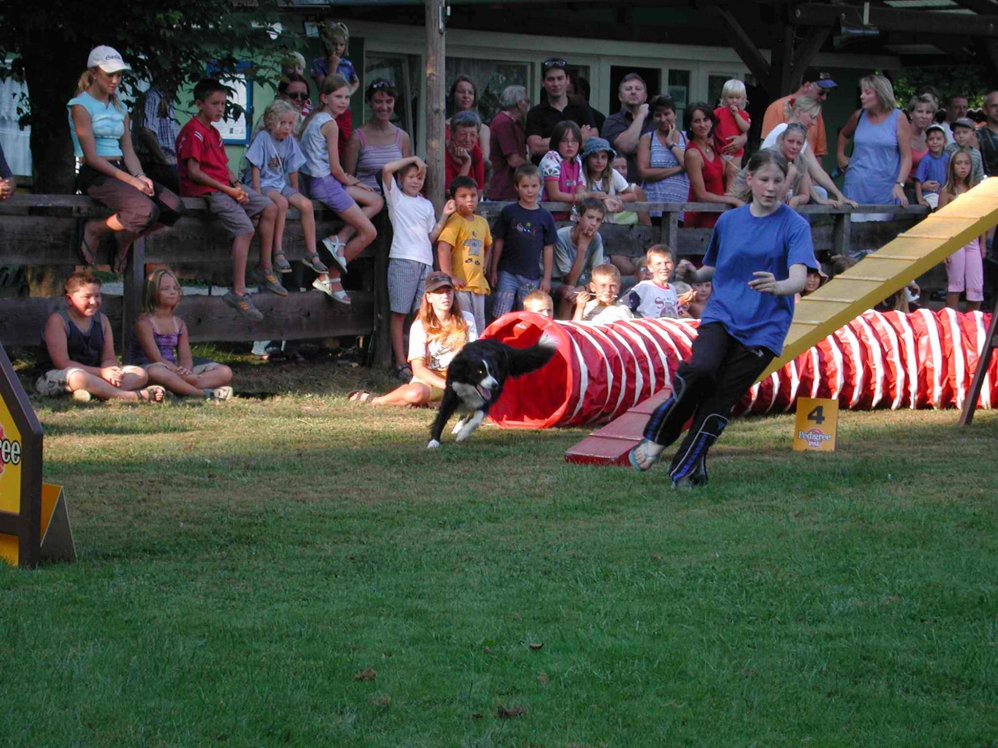 Jung und Alt betätigen sich sportlich mit ihren Hunden gemeinsam im Parcours. Dabei sind hier alle Hunderassen und -größen in unterschiedlichen Leistungsruppen vertreten.